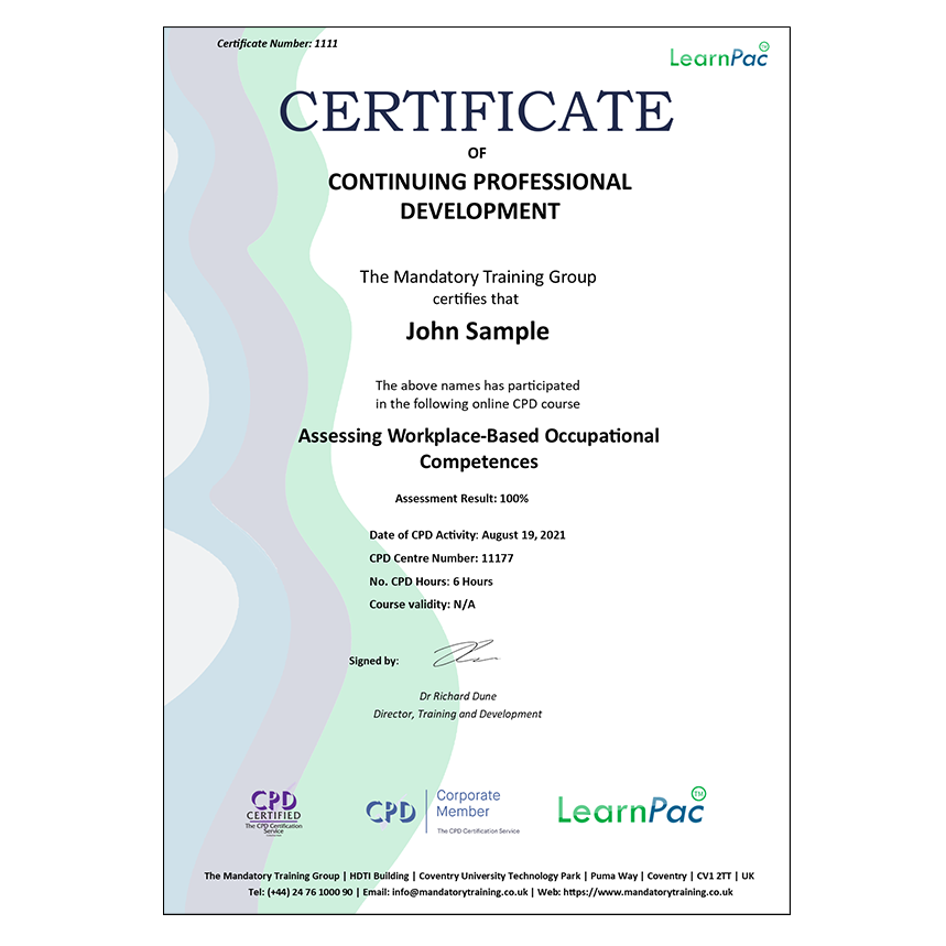 Welcome to our online Assessing Workplace-Based Occupational Competences training course. All our online training courses, programmes and qualifications are accredited by the CPD Certification Service (CPDUK).