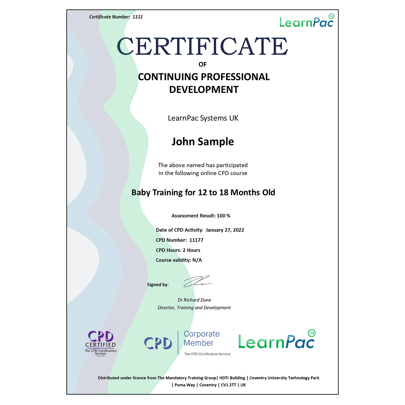 Welcome to our online Baby Training for 12-18 Months Old training course. All our online courses, programmes and qualifications are accredited by the CPD Certification Service (CPDUK).