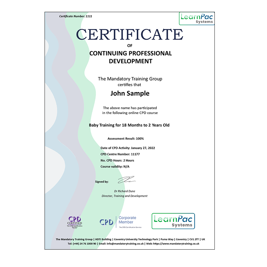 Welcome to our online Baby Training for 18 Months to 2 Years Old training course. All our online training courses, programmes and qualifications are accredited by the CPD Certification Service (CPDUK).