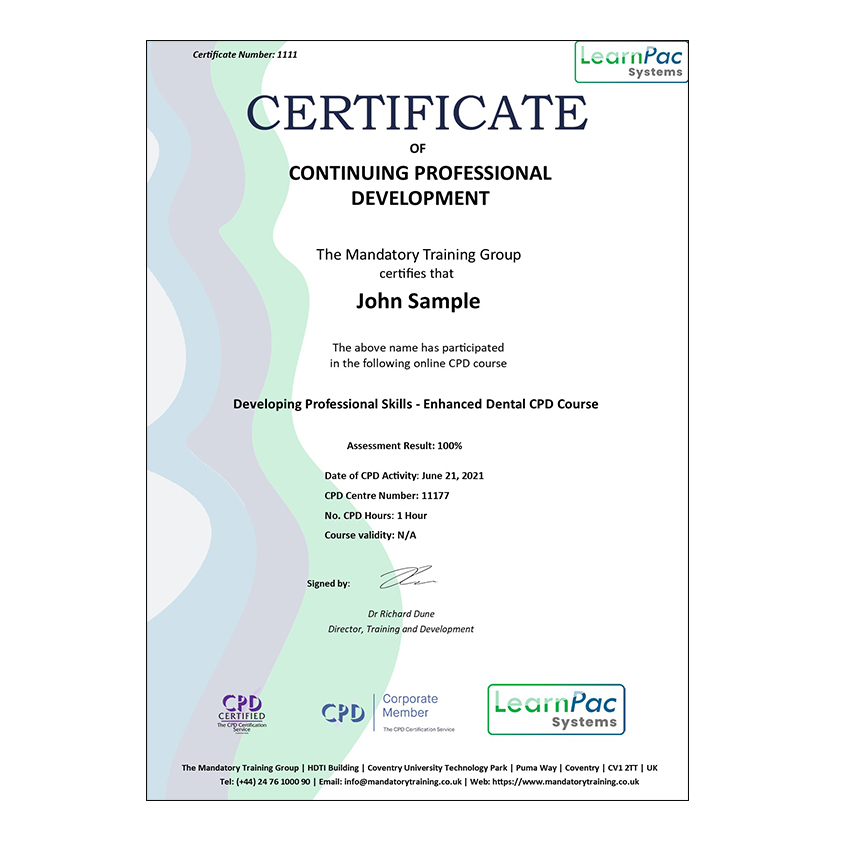 Welcome to our online Developing Professional Skills – Enhanced Dental CPD Course. All our online training courses, programmes and qualifications are accredited by the CPD Certification Service (CPDIJK).