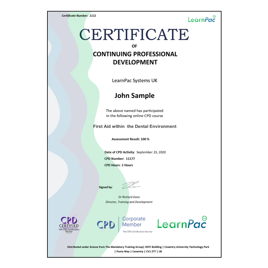 Welcome to our online First Aid within the Dental Environment – Enhanced Dental CPD Course training course. All our online training courses, programmes and qualifications are accredited by the CPD Certification Service (CPDUK).