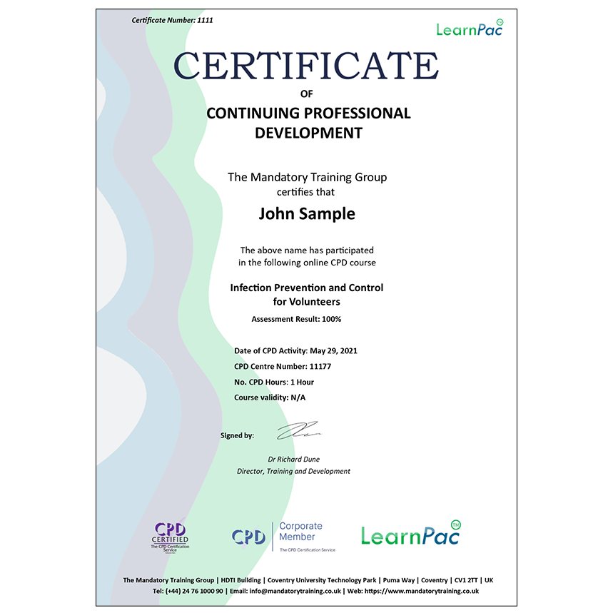 Welcome to our online Infection Prevention and Control for Volunteers training course. All our online training courses, programmes and qualifications are accredited by the CPD Certification Service (CPDUK).