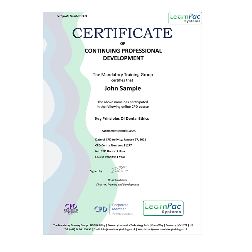 Welcome to our online Key Principles of Dental Ethics training course. All our online training courses, programmes and qualifications are accredited by the CPD Certification Service (CPDUK).
