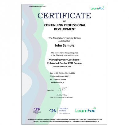 Welcome to our online Managing your Cost Base – Enhanced Dental CPD Course. All our online training courses, programmes and qualifications are accredited by the CPD Certification Service (CPDUK).