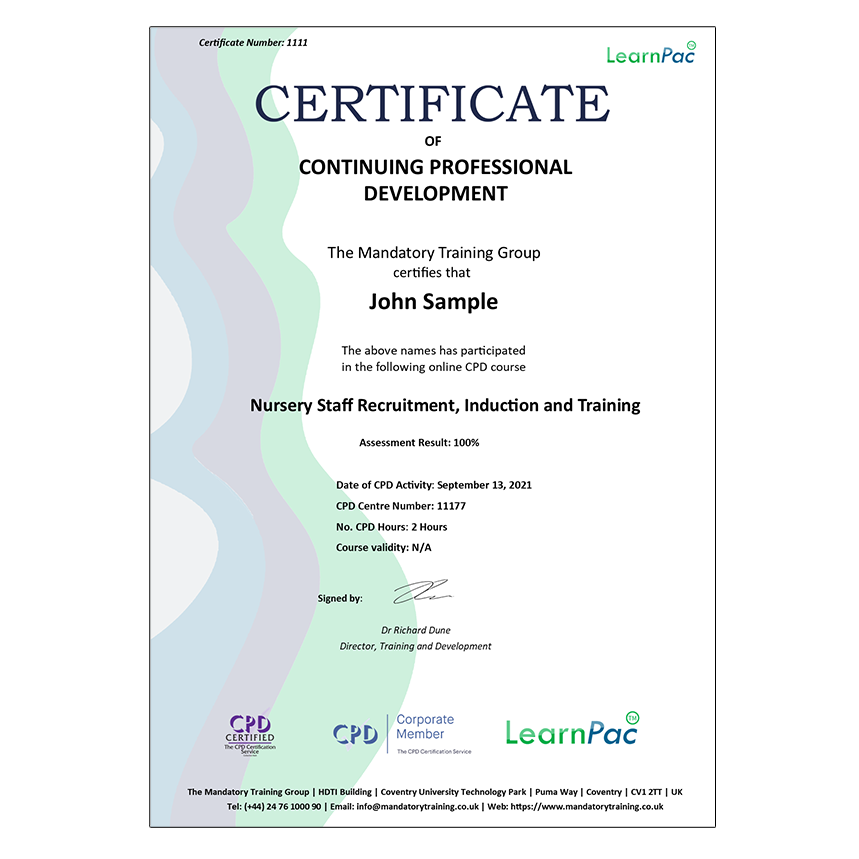 Welcome to our online Nursery Staff Recruitment, Induction and Training course. All our online training courses, programmes and qualifications are accredited by the CPD Certification Service (CPDUK).