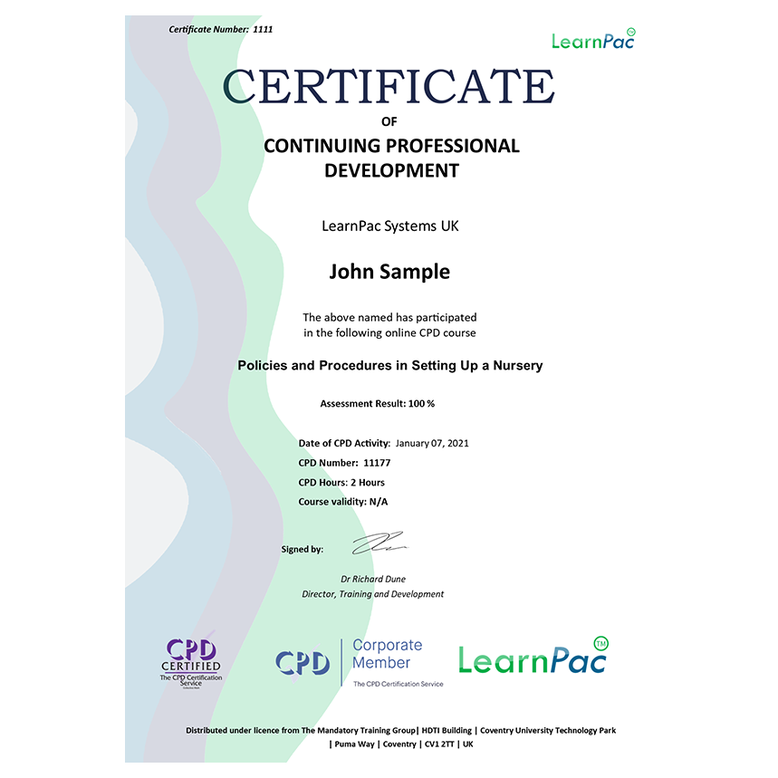 Welcome to our online Policies and Procedures in Setting Up a Nursery training course. All our online training courses, programmes and qualifications are accredited by the CPD Certification Service (CPDUK).