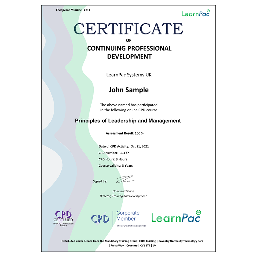 Welcome to our online Principles of Leadership and Management course. All our online training courses, programmes, and qualifications are accredited by the CPD Certification Service (CPDUK).