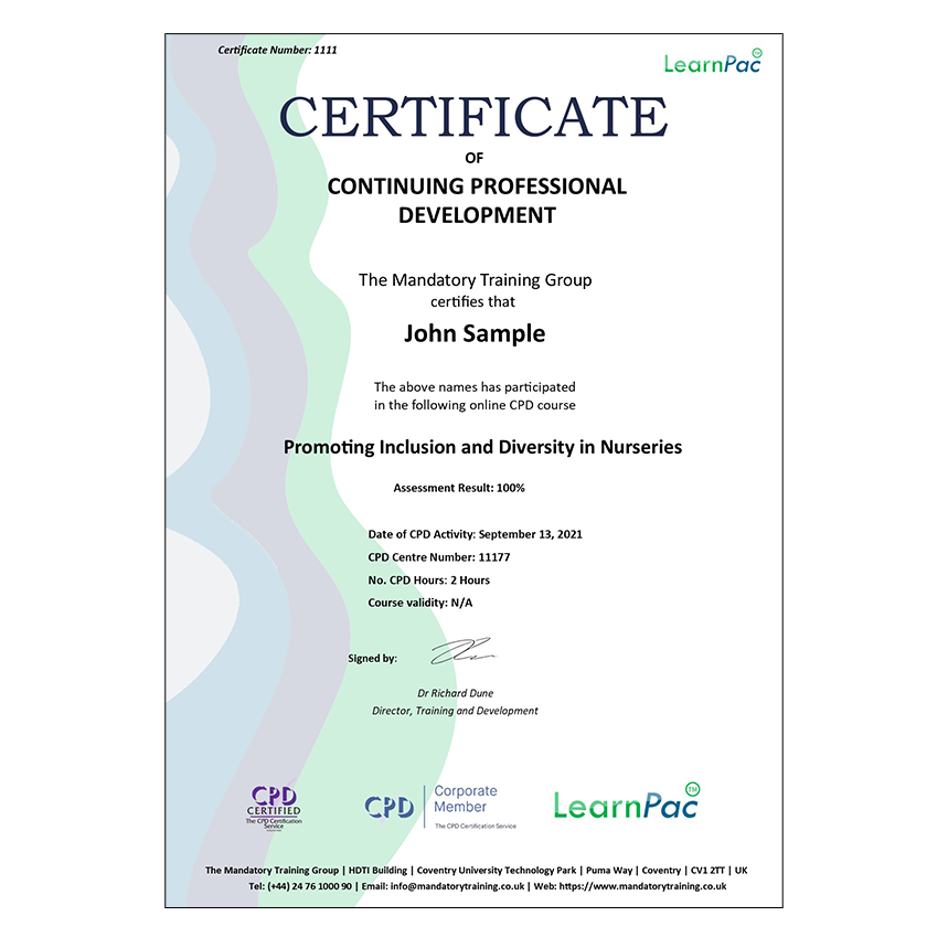 Welcome to our online Promoting Inclusion and Diversity in Nurseries training course. All our online training courses, programmes and qualifications are accredited by the CPD Certification Service (CPDUK).